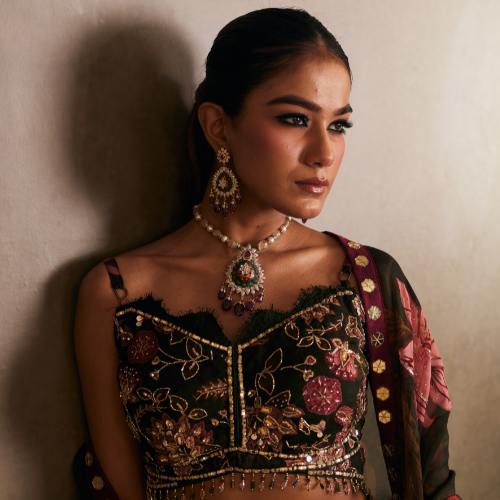 Elevate your style with this exquisite 14Kt Gold Kundan Polki Pearl Necklace featuring elegant green and pink accents — perfect for weddings, festive wear, and gifting.