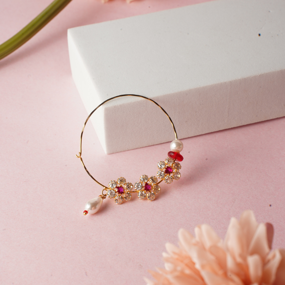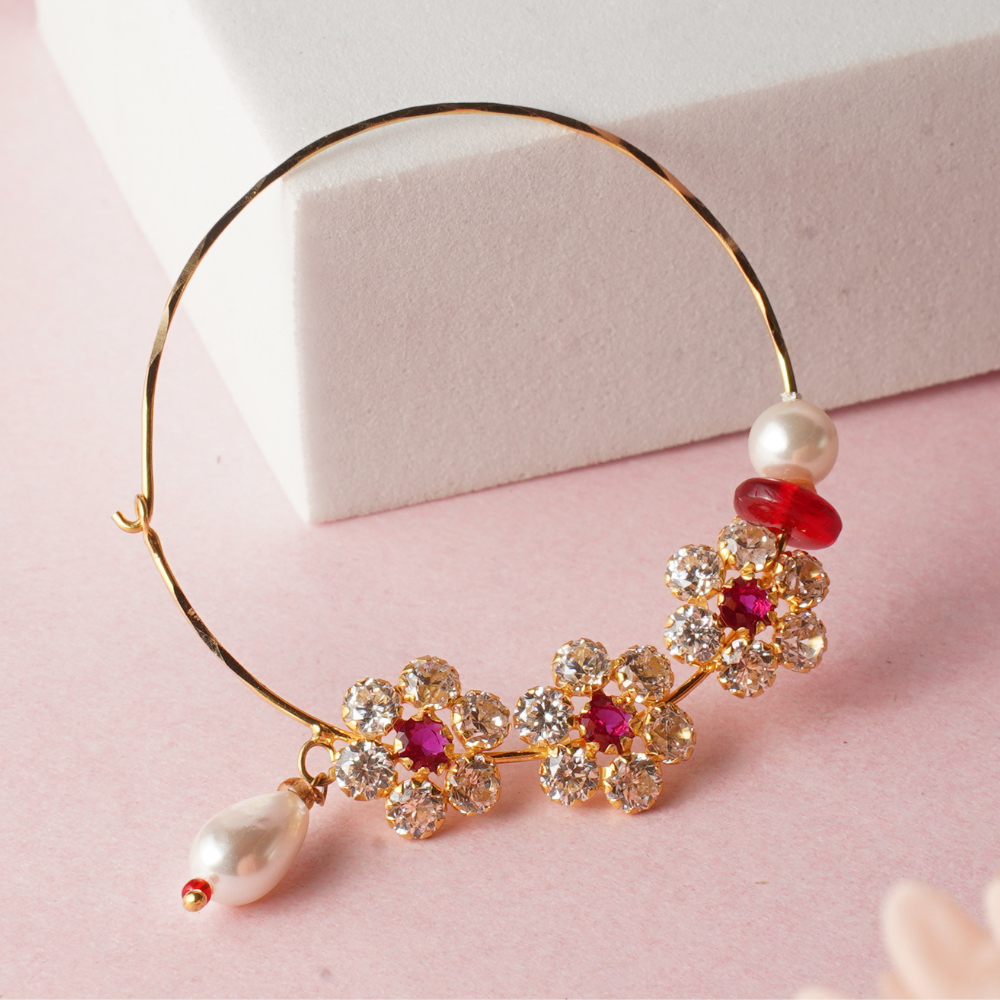 18Kt Gold Bridal Floral Nath with Red & Clear Stones and Pearl Drop Loops NT18/128