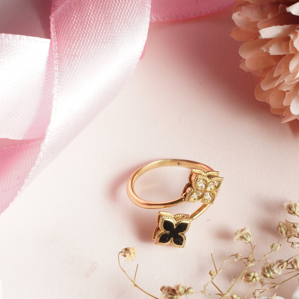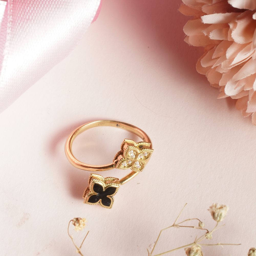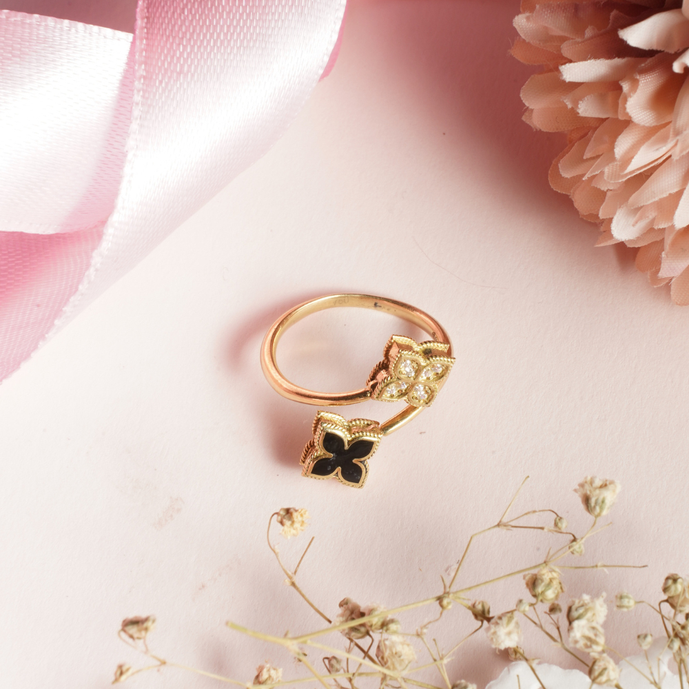 Beautiful 18KT yellow gold flower ring featuring a princess floral design with an open center. This adjustable gold ring can be gently squeezed to fit, making it ideal for daily wear from BK Saraf.