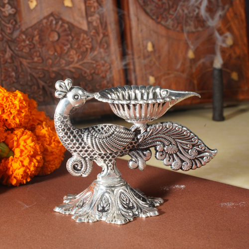 925 Silver Peacock Oil Lamp Diya for Pooja – Elegant handcrafted diya made in pure 925 sterling silver, featuring a beautifully detailed peacock design. Perfect for daily puja rituals, festive occasions, and gifting.