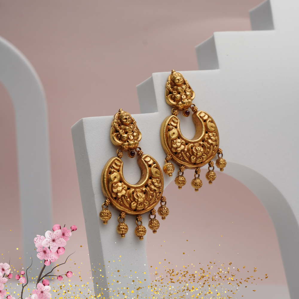 Embrace divine elegance with this 22Kt Yellow Gold Antique Temple Chandbali. Featuring intricate temple-inspired motifs and traditional craftsmanship, this chandbali is crafted in pure 22 karat gold. Its antique finish and graceful crescent shape make it a perfect statement piece for weddings, festive occasions, and temple ceremonies. A timeless treasure for every traditional jewellery lover.