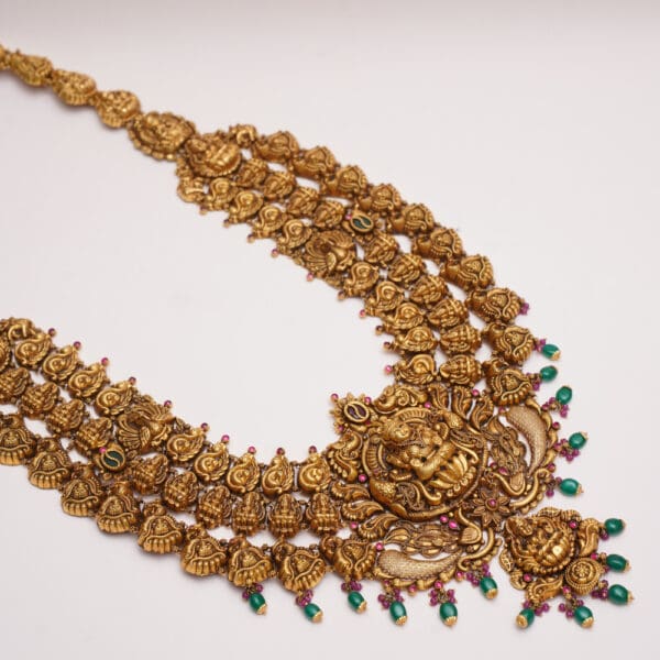 This Goddess Lakshmi temple necklace is not just jewelry; it’s a statement of faith, beauty, and tradition. With its intricate detailing and divine aura, it’s the perfect heirloom piece for generations to cherish.