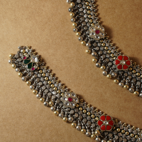 This exquisite antique silver anklet features delicate flower meenakari work, showcasing timeless craftsmanship and traditional charm. Handcrafted in pure 925 silver, it beautifully blends vintage elegance with vibrant enamel detailing. Perfect for weddings and festive occasions, this heavy anklet makes an elegant statement piece and a thoughtful bridal gift.