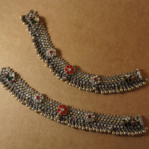 Antique 925 Silver Heavy Anklet with Floral Meenakari Design PYSS/720