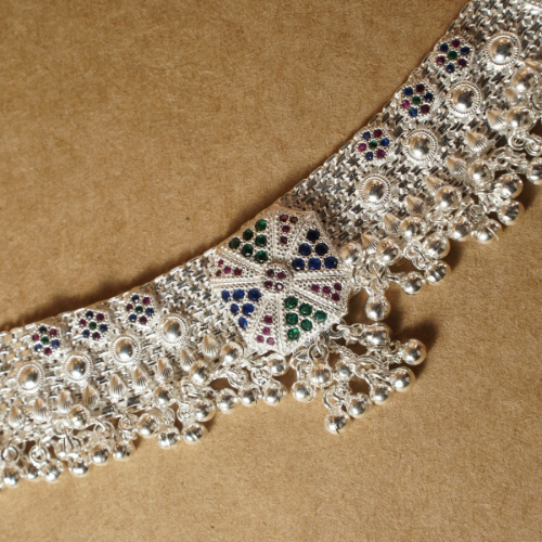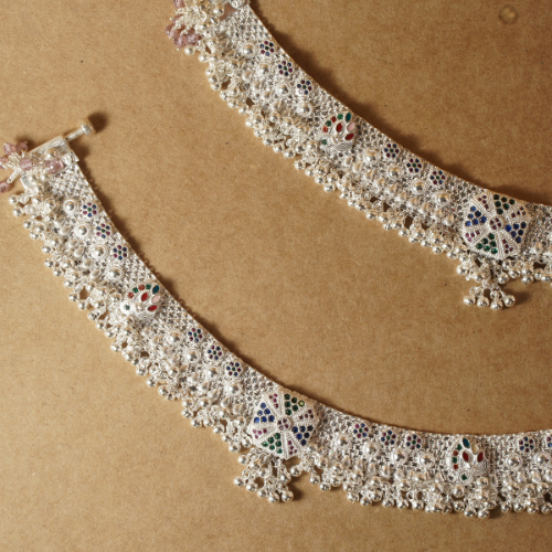 Elegant and timeless, this silver anklet with floral meenakari work is beautifully handcrafted for brides. Made from pure 925 silver, its intricate design and heavy craftsmanship make it a stunning wedding adornment and a perfect bridal gift symbolizing tradition and grace.